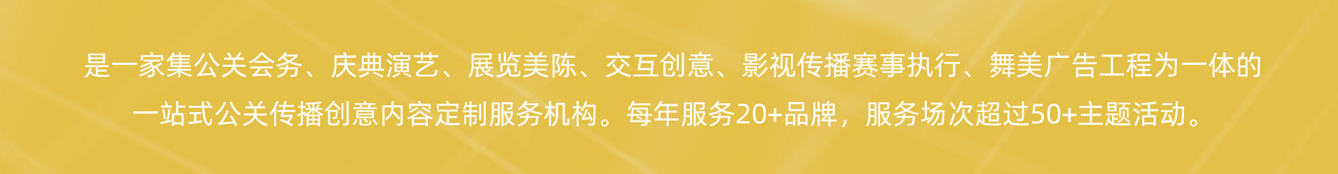 集公關會務、慶典演藝、展覽美陳、交互創意、 、舞美廣告工程為一體的一站式公關傳播創意內容定制服務機構。每年服務20+品牌,服務場次超過50+主題活動。